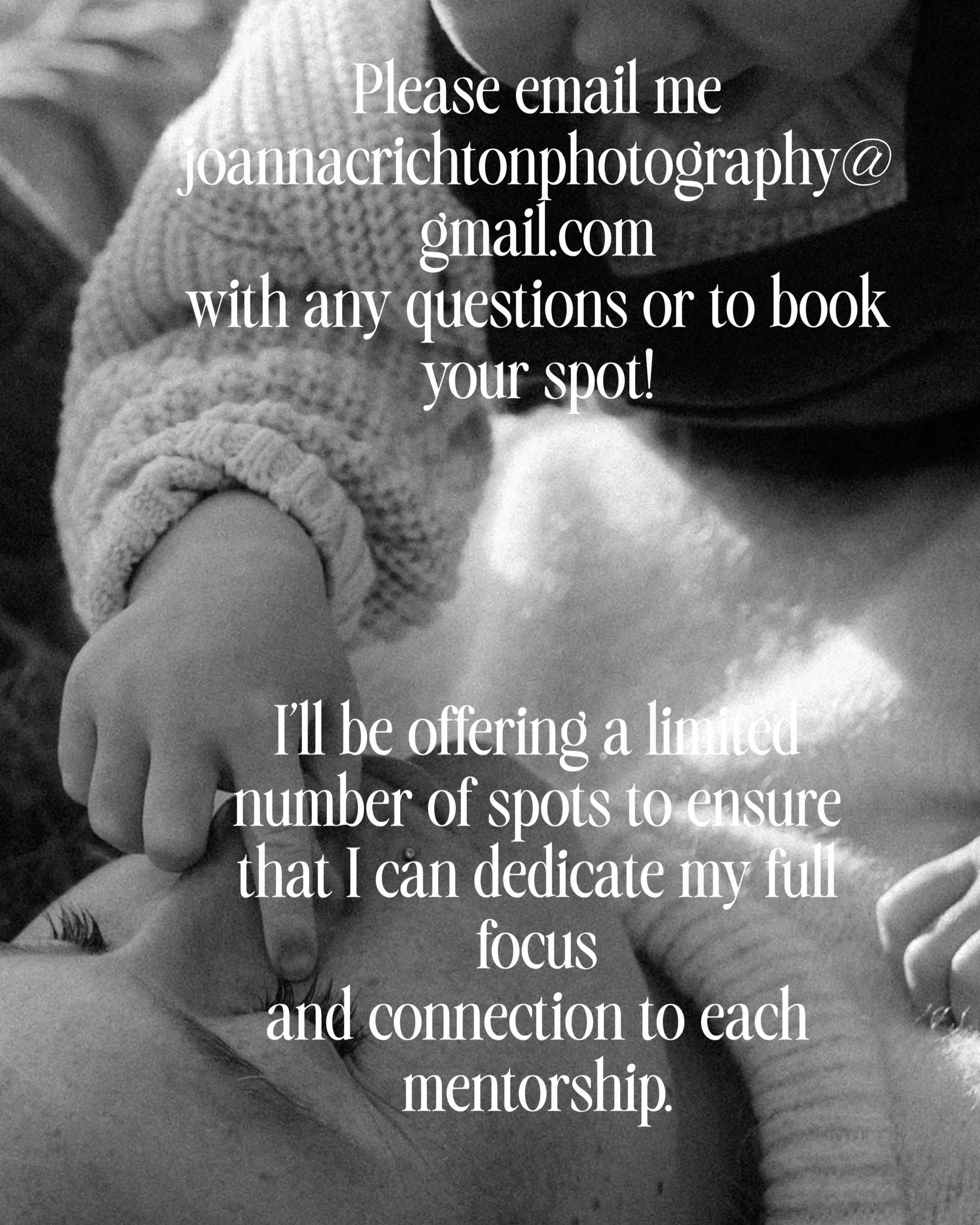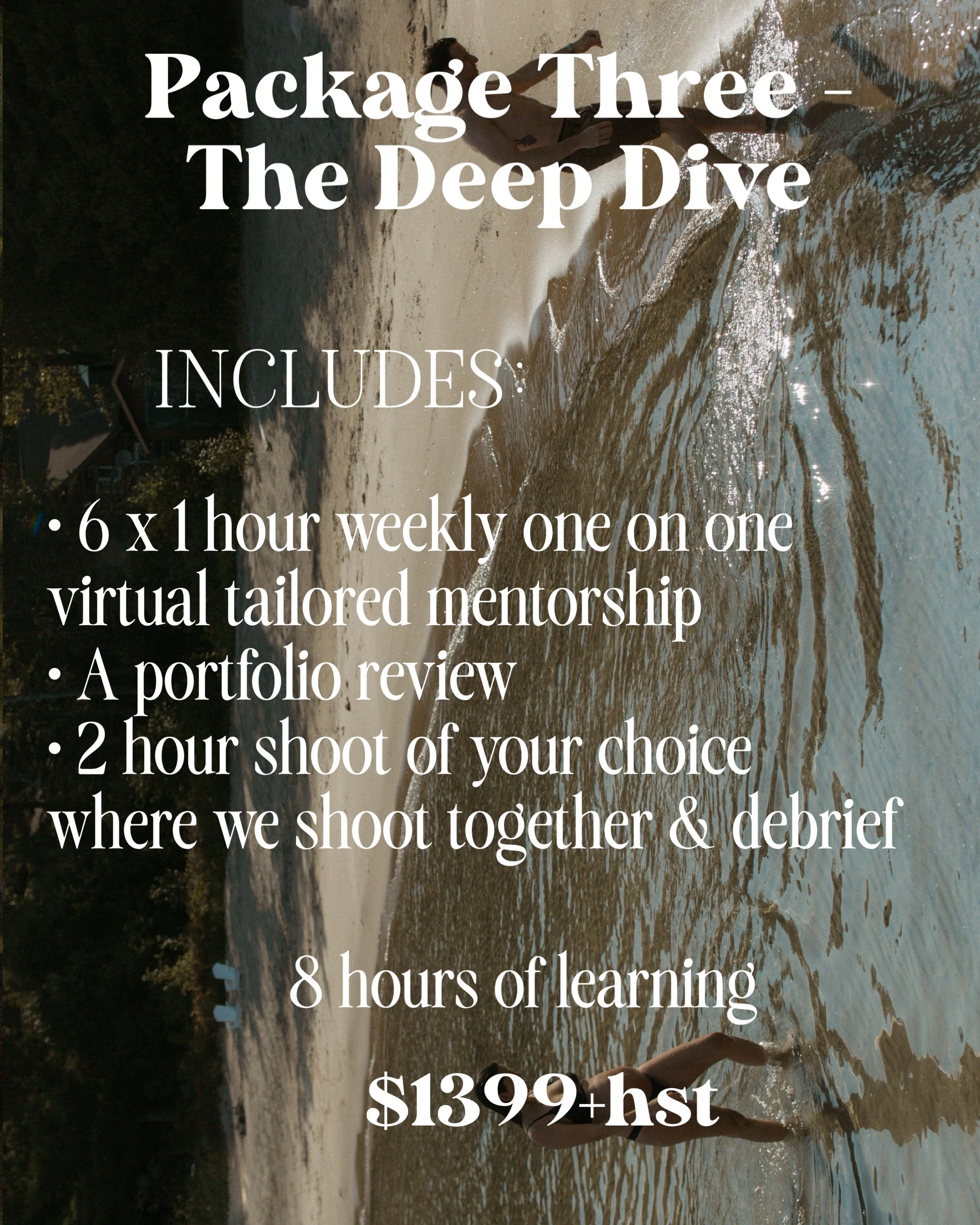 Hello! Thanks for being here! My one on one photography mentorships focus on discovering the artist within you. Whether you’re feeling creatively blocked or just want to refine your vision, this mentorship is designed to help you unleash your creativity, explore new perspectives, and feel refreshed in your artistry. I will be offering these options from January to April. Check out the different packages below.